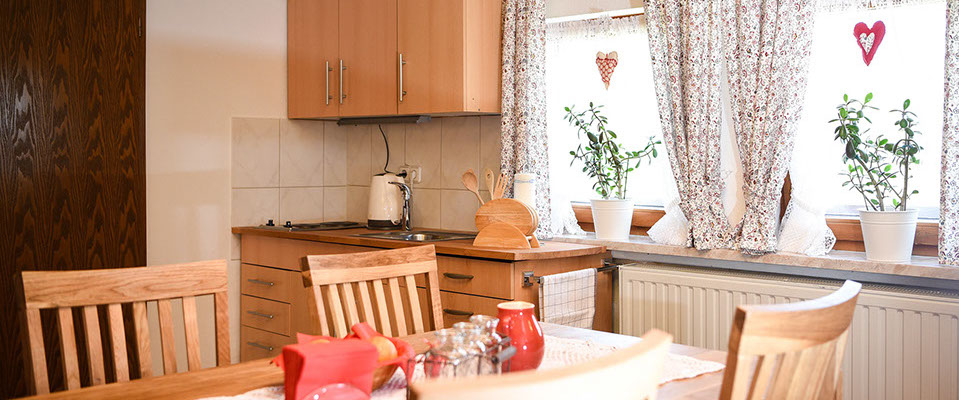 Die Ferienwohnung "Groß" hat 2 separate Schlafzimmer. Im Wohnraum  befindet sich eine Schlafcouch, Küchenzeile, Mikrowelle und eine Essecke.